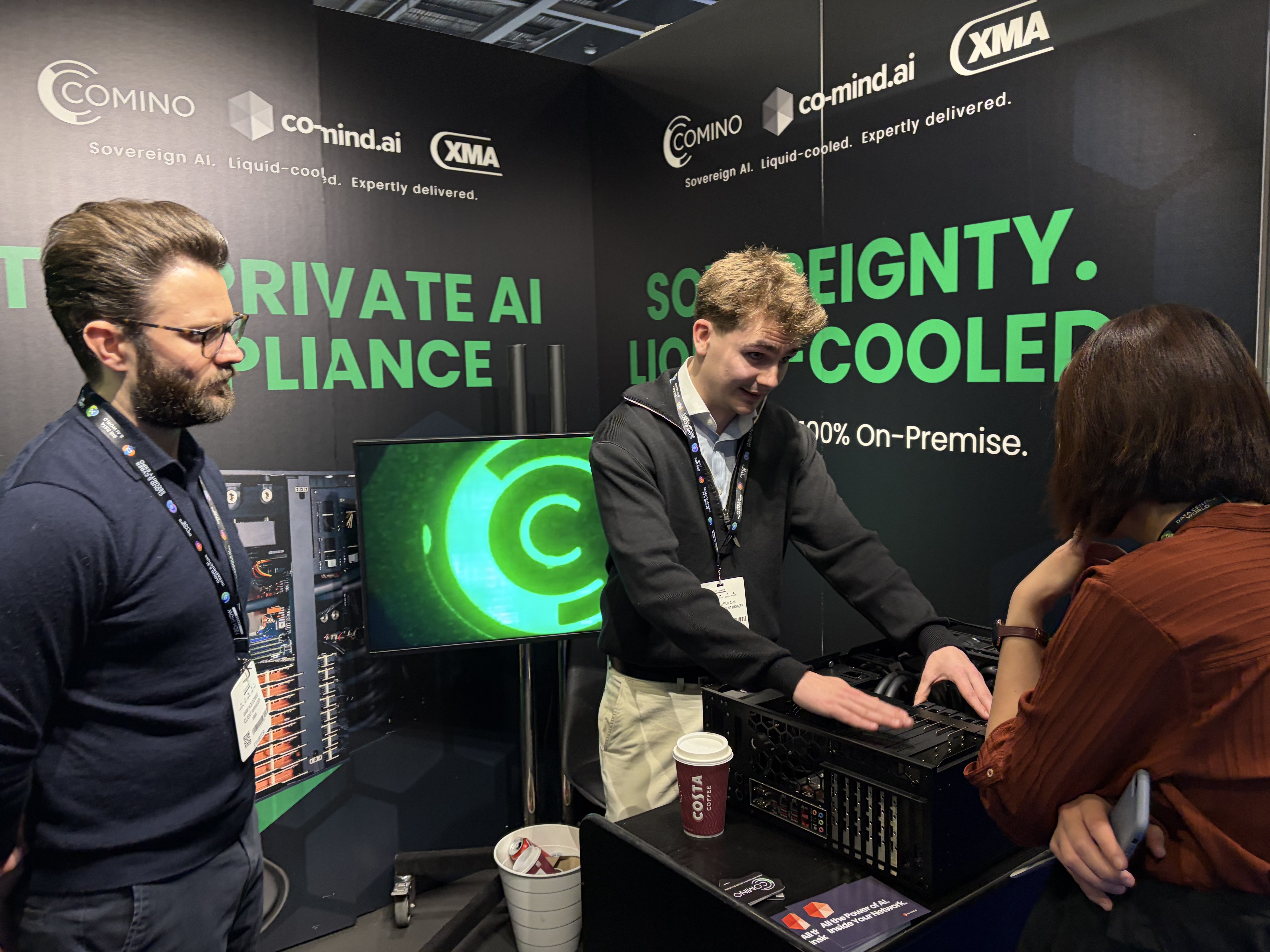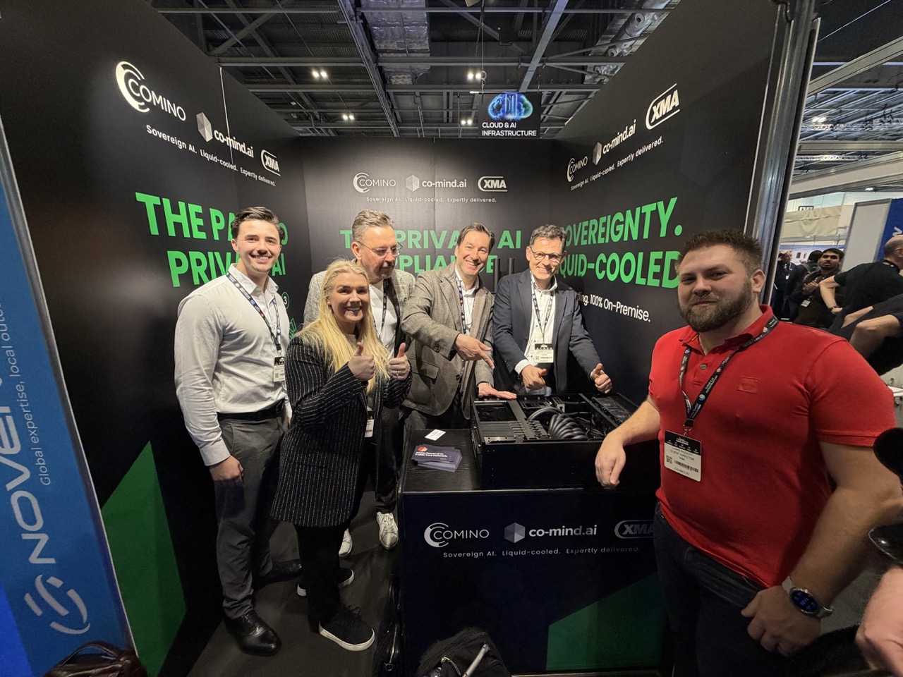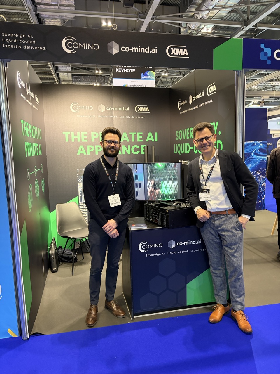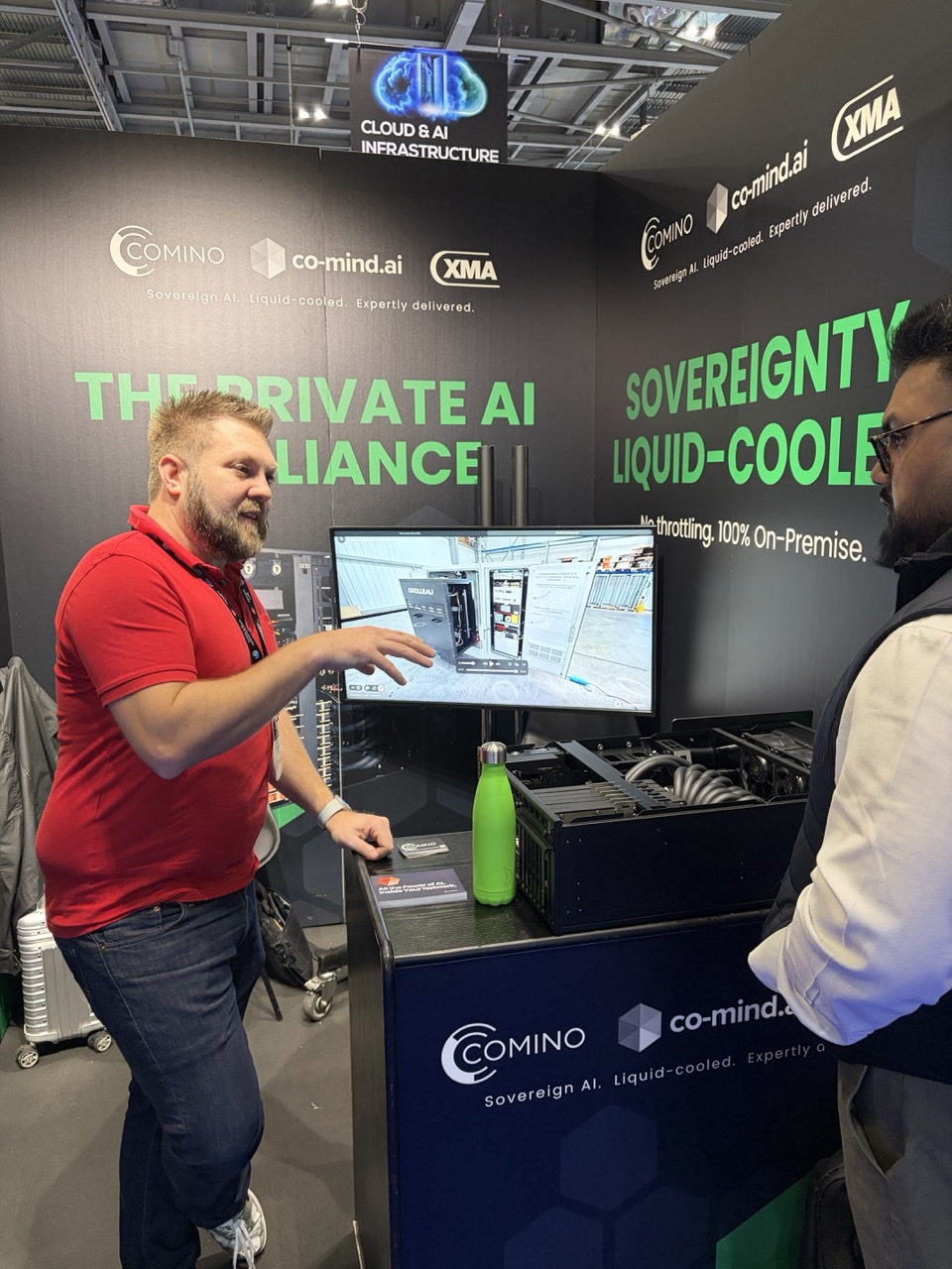 Instead of presenting hardware alone, the collaboration with co-mind.ai allowed the team to demonstrate a fully integrated solution: Comino's liquid-cooled compute combined with co-mind's software layer, delivering a turnkey Private AI appliance for enterprise deployment. This shift from discussing components to showcasing a complete solution resonated with many attendees.